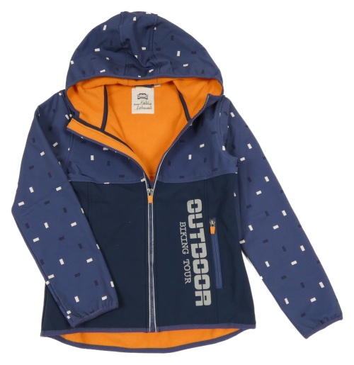 Tmavomodro-vzorovaná softshellová bunda s nápisem a kapucí