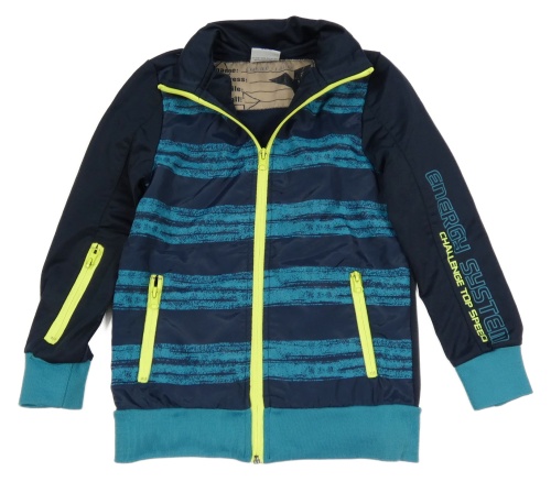 Tmavomodro-tyrkysová pruhovaná šusťáková sportovní bunda s nápisem Yigga