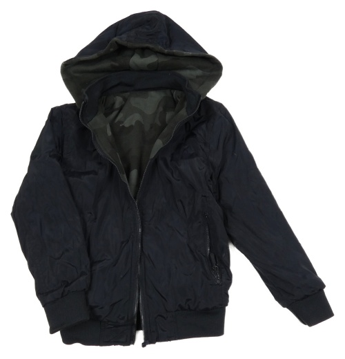 Tmavomodrá šusťáková oboustranná bunda s kapucí