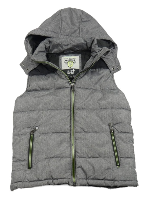 Šedo-černá melírovaná prošívaná šusťáková zateplená vesta s odepínací kapucí C&A