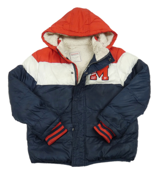 Tmavomodro-bílo-červená prošívaná šusťáková zimní bunda s písmenkem a kapucí MINOTI