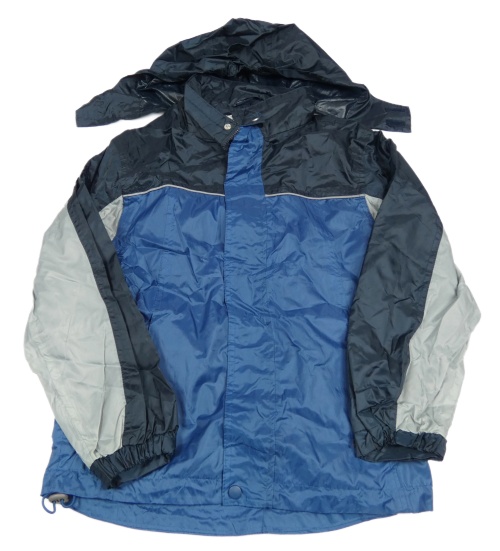 Modro-tmavomodro-šedá šusťáková jarní bunda s ukrývací kapucí