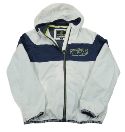 Bílo-tmavomodrá šusťáková jarní bunda s písmenky a číslem a kapucí C&A