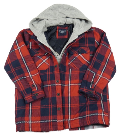 Červeno-tmavomodrá kostkovaná zateplená košilová bunda s teplákovou kapucí Next
