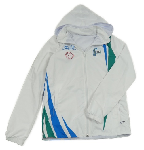 Bílo-modro-zelená šusťáková jarní bunda s nápisy a kapucí