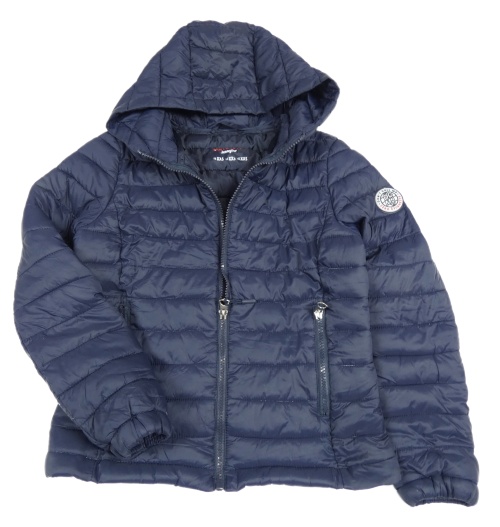 Tmavomodrá šusťáková prošívaná zateplená bunda s nášivkou a kapucí