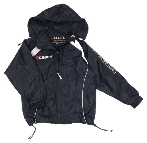 Tmavomodrá šusťáková jarní bunda s nápisem a kapucí