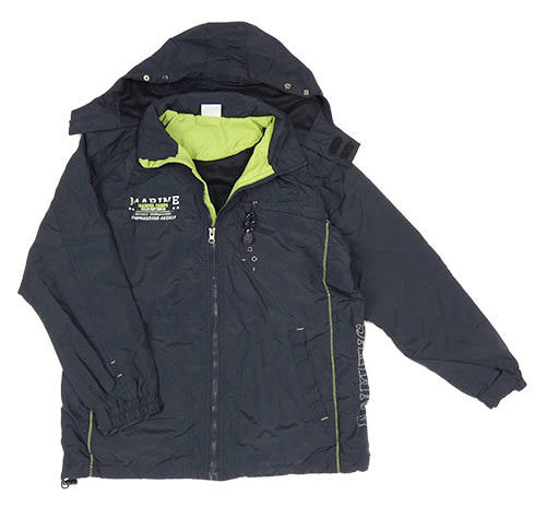 Tmavomodrá šusťáková podzimní bunda s nápisy a ukrývací kapucí POCOPIANO