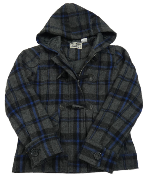 Šedo-černo-modrá kostkovaná vlněná zateplená bunda s kapucí