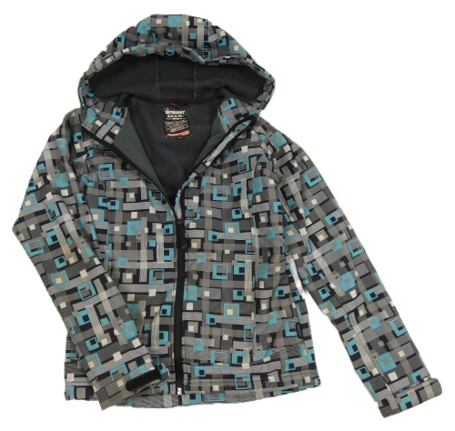 Šedo-světlemodrá vzorovaná softshellová funkční bunda s kapucí