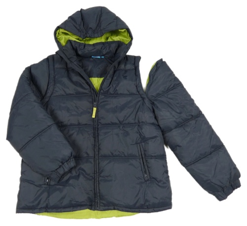 Tmavomodrá prošívaná šusťáková zimní bunda s odepínacími rukávy a kapucí muddy puddles