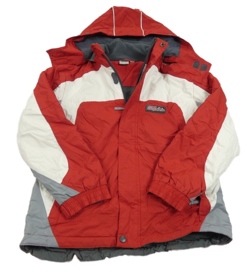 Červeno-šedo-bílá šusťáková zimní lyžařská bunda s nášivkou a odepínací kapucí alive