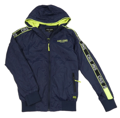 Tmavomodro-neonově žlutá šusťáková jarní bunda s nápisy a kapucí