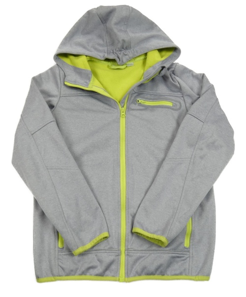 Šedá melírovaná softshellová bunda s neonovým zipem a kapucí Crivit