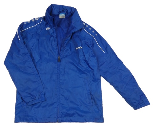 Safírová šusťáková jarní sportovní bunda s logem a ukrývací kapucí JAKO
