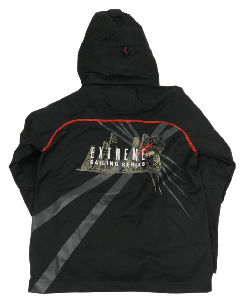 Černo-červená softshellová bunda s nápisy a kapucí