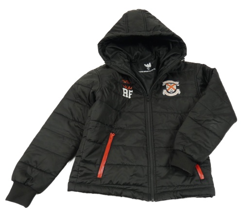 Černá šusťáková zateplená bunda s potiskem a kapucí
