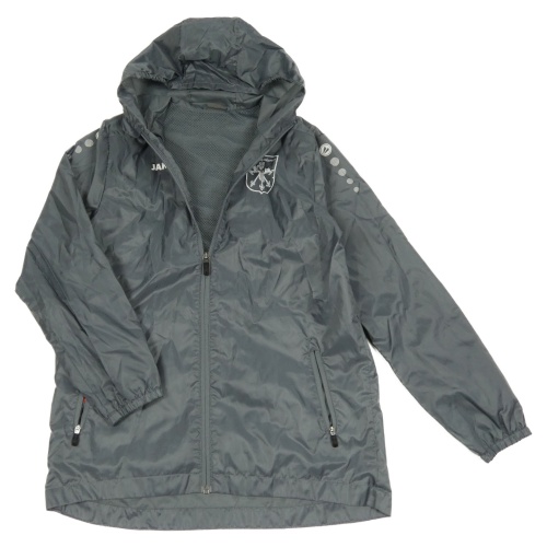 Šedá šusťáková sportovní bunda s potiskem a kapucí Jako