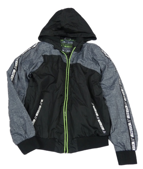 Černo-šedý/melírovaný šusťákový jarní bomber s pruhem s nápisy a kapucí Y.F.K.