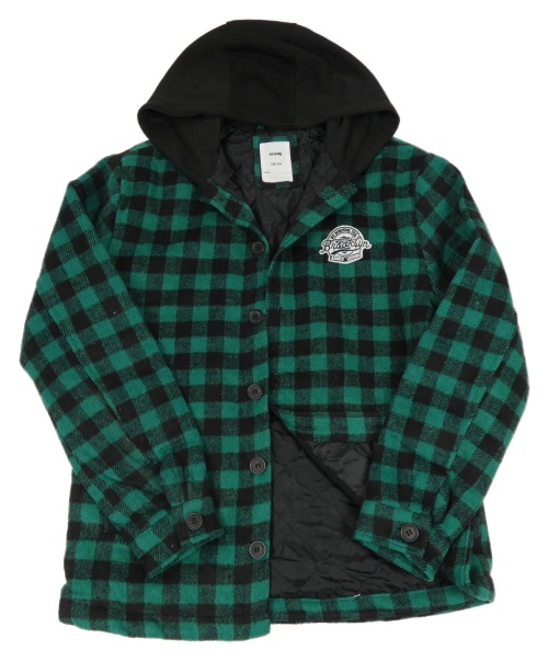 Červeno-zelená kostkovaná podšitá košilová flaušová bunda s nášivkou a kapucí Sinsay