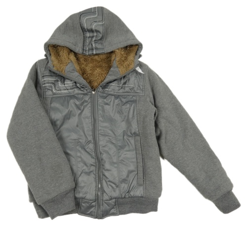 Šedá šusťáková zateplená bunda s teplákovými rukávy a a potiskem a kapucí