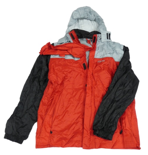 Červeno-šedo-černá šusťáková podzimní bunda s číslem a ukrývací kapucí + sáček alive
