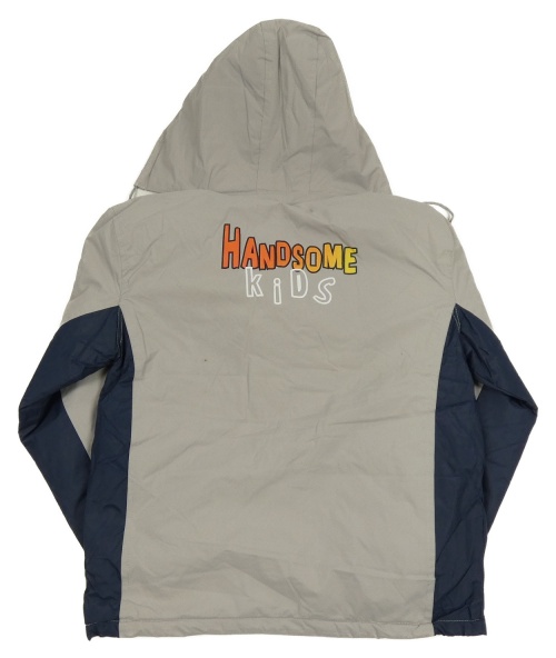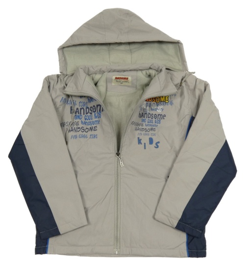 Šedo-tmavomodrá šusťáková zateplená bunda s nápisy a kapucí