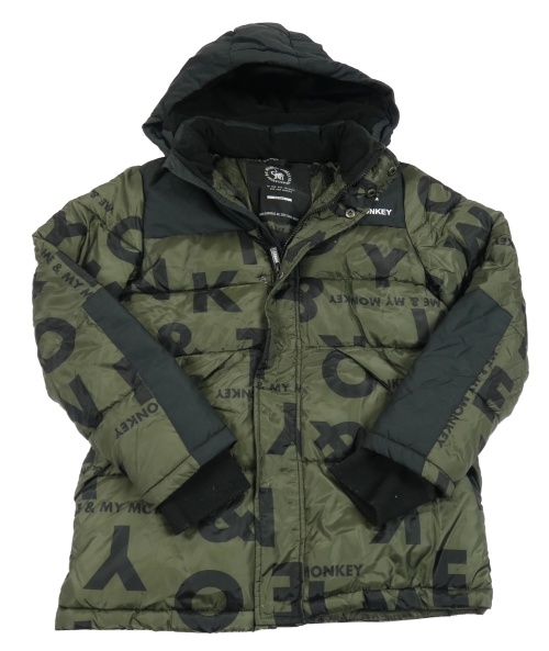 Khaki-černá šusťáková zimní bunda s nápisy a kapucí