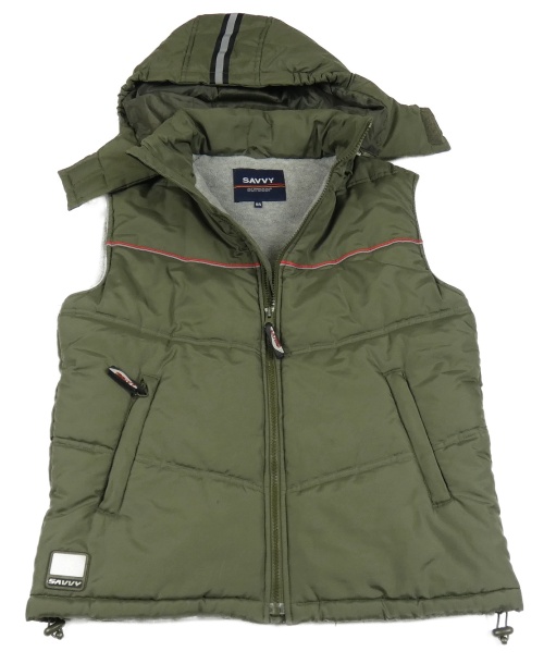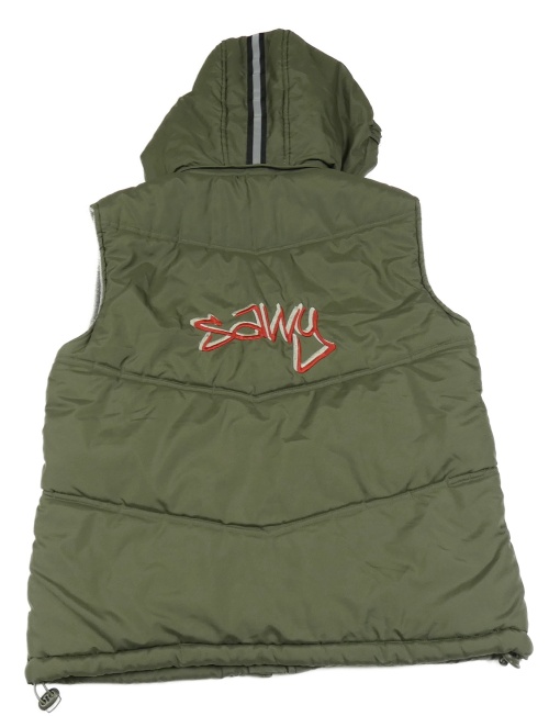 Khaki šusťáková zateplená vesta s nápisem a kapucí