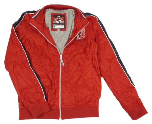 Červená šusťáková jarní bunda s nápisem we