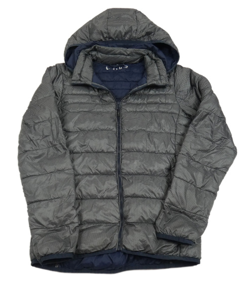 Šedo-tmavomodrá vzorovaná prošívaná šusťáková zateplená bunda s odepínací kapucí