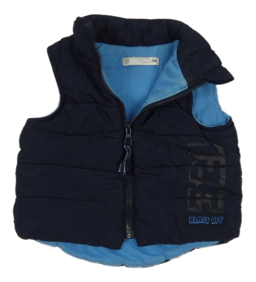 Tmavomodrá šusťáková zateplená vesta s nápisem