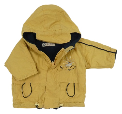 Žlutá šusťáková zateplená bunda s výšivkou a kapucí