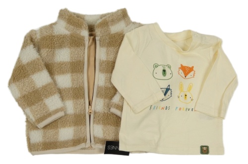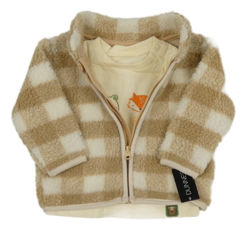 Nové - 2set - Béžovo-bílá huňatá kostkovaná bunda + smetanové triko se zvířátky Dunnes Stores