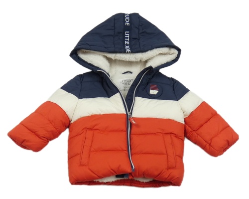Červeno-bílo-tmavomodrá prošívaná šusťáková zimní bunda s nášivkou a kapucí F&F