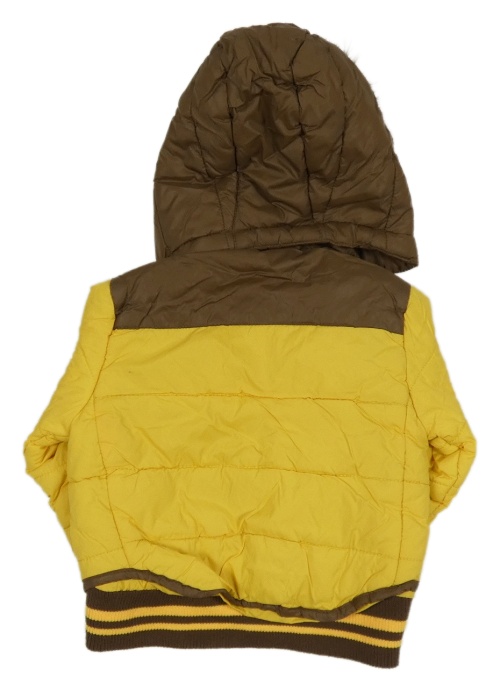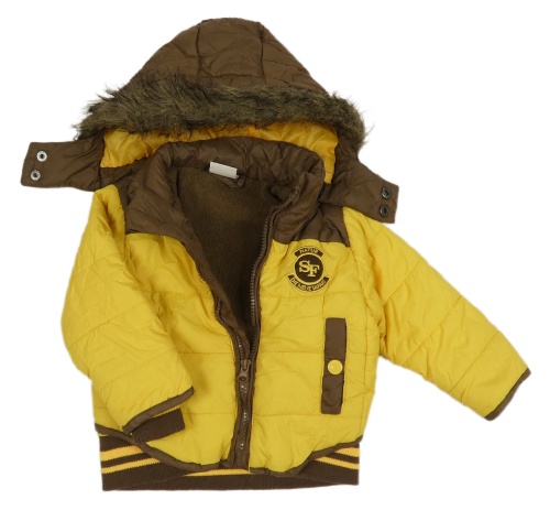 Žluto-hnědá šusťáková zimní bunda s nášivkou a kapucí