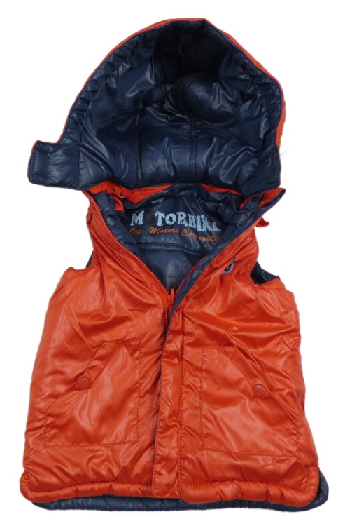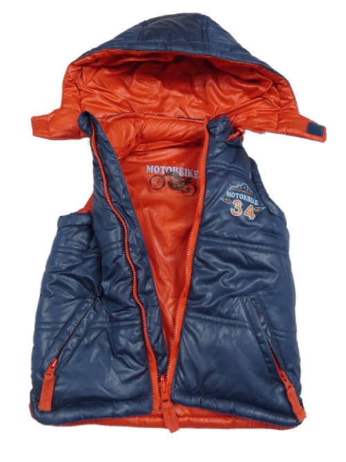 • Tmavomodrá prošívaná šusťáková zateplená oboustranná vesta s číslem a odepínací kapucí ORCHESTRA