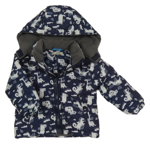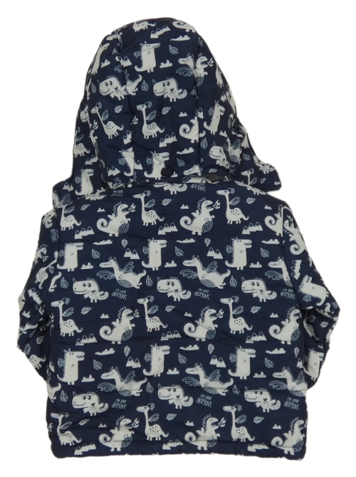 Tmavomodrá šusťáková zateplená bunda s dinosaury a kapucí