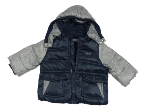 • Tmavomodro-šedá prošívaná šusťáková zimní bunda se vzorovanými rukávy a odepínací kapucí Chicco