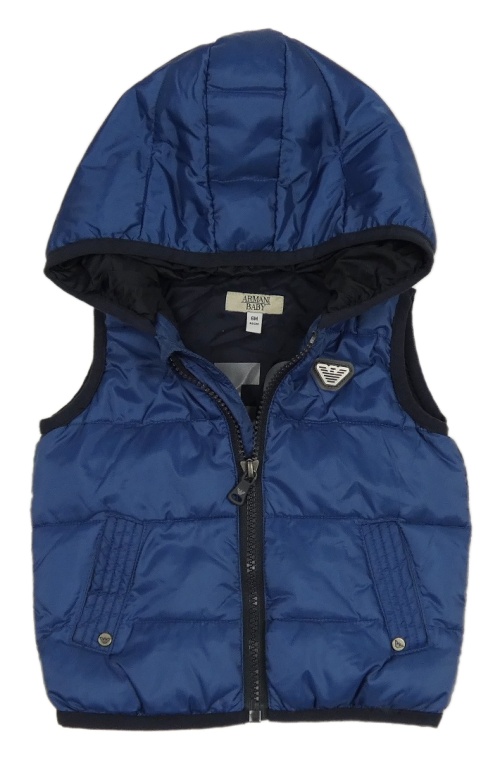 Tmavomodrá šusťáková zateplená vesta s nášivkou a kapucí Armani