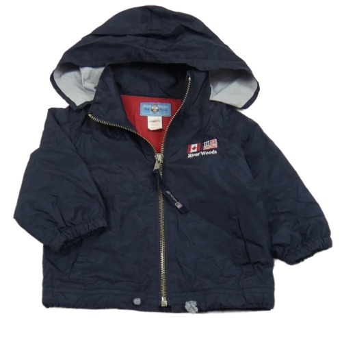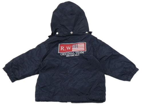 Tmavomodrá šusťáková jarní bunda s vlajkami a kapucí