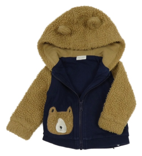 Tmavomodro-béžová teplákovo/huňatá bunda s medvídkem a kapucí Next