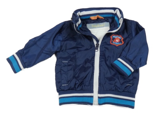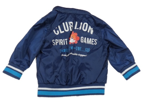 Tmavomodrá šusťáková jarní bunda s nášivkou a ukrývací kapucí