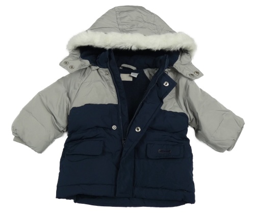 Šedo-tmavomodrá prošívaná šusťáková zimní bunda s odepínací kapucí s kožešinou Chicco