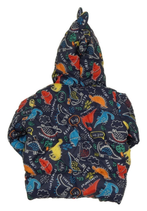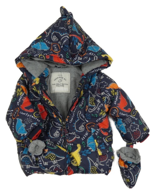 Tmavomodro-barevná šusťáková zateplená bunda s dinosaury a kapucí + rukavice George