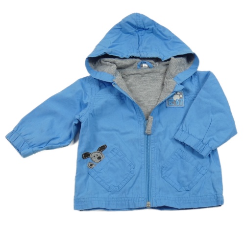 Modrá plátěná jarní bunda se psem a kapucí