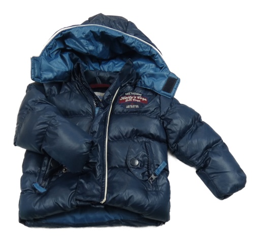 Tmavomodrá šusťáková zimní bunda s nášivkou a kapucí