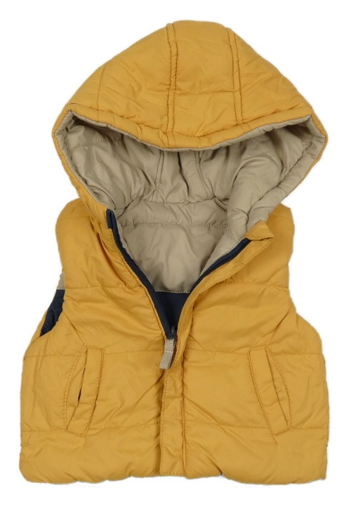 Žlutá šusťáková zateplená oboustranná vesta s kapucí