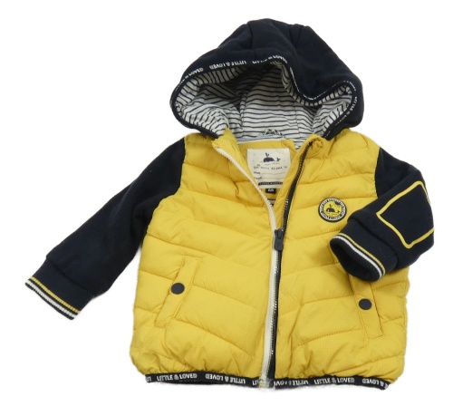 Tmavomodro-žlutá šusťáková zateplená bunda s mikinovými rukávy a kapucí