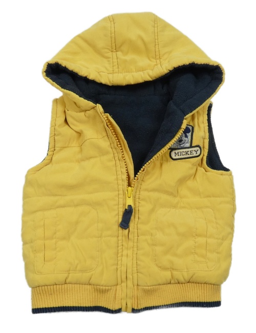 Žluto-tmavomodrá zateplená vesta s Mickey Mousem a kapucí